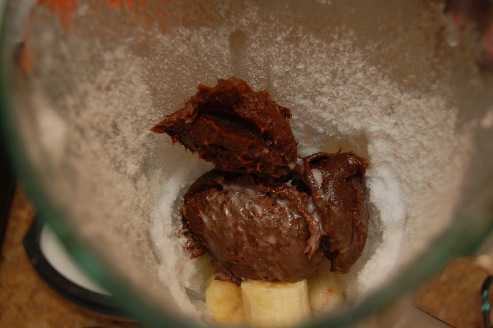 1 ripe avocado1/4 c. almond butter2 Tbs. cocoa powder3 Tbs. sweetened condensed milk[or substitute 3/4 c. avocado nutella for above ingredients (recipe here)]1/2 c. almond milk1/2 c. plain or vanilla yogurt1 frozen banana or a handful of ice