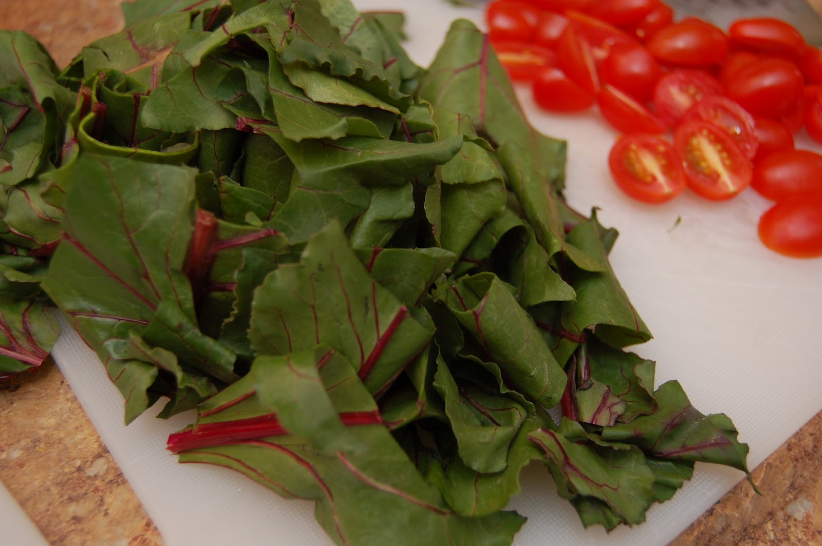I grabbed a bunch of beets at my farmer’s market and immediately noticed how wonderfully edible the greens looked, as opposed to the way they usually seem to arrive either wilted, half-eaten by bugs (misty watercolored veggie CSA memories), or bruised. I was so excited to eat them, I turned some of them into a smoothie for us as soon as we got home. They were as delicious as Attainable Sustainable promised. Luckily I only needed a small handful for the drink, so I was free to brainstorm what I might do with them at dinner. I had gotten cherry tomatoes, parsley, and mint for tabbouleh (yes, out of season. Grown indoors in MA. Our “season” is so short, I couldn’t wait!), so I was inspired by those flavors to make a pasta primavera-ish dish.