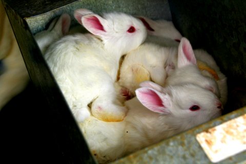 Rabbits, like chickens, can be quite vicious to one another. Chickens are omnivores, and they can and do kill and eat each other if given the right circumstances. If stressed they tend to peck each other to death, which is why their beaks are sliced off in CAFOs. Rabbits, although herbivores, are not much different. The does must be separated or they will kill each others’ offspring; the buck will also kill the babies, and if he’s too excitable in the company of a female, she’ll chew his balls off. Knowing this, I can’t see rabbits as cute or cuddly anymore. I think Beatrix Potter must never have met an actual rabbit.