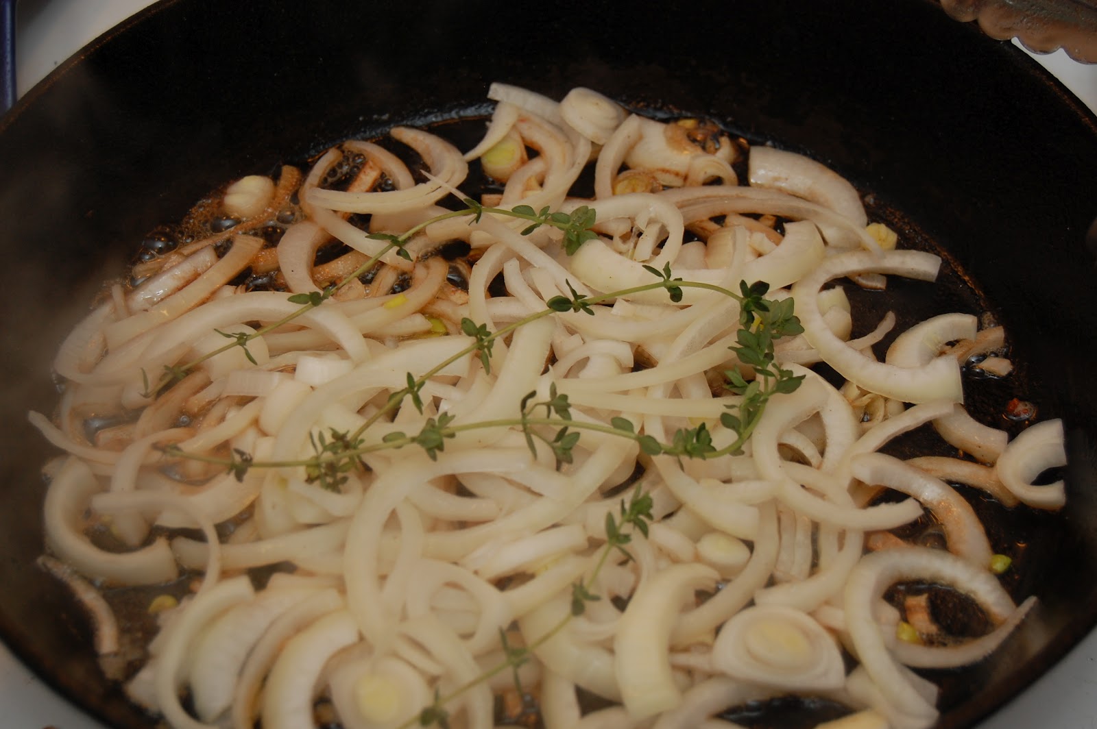 1. In a large skillet over medium-high heat, lightly brown the kielbasa until golden, about 5 minutes. Transfer to a plate. Melt the butter in the skillet. Stir in the onion and thyme, and stir briefly to coat the onion with butter. Cook onion, without stirring, until dark brown, about 5 minutes. Add a pinch of salt and cook on low heat until very soft and caramelized, 20 to 30 minutes. Stir in 2 tablespoons water and scrape up any browned bits from the bottom of the pan. Transfer onion to a bowl.