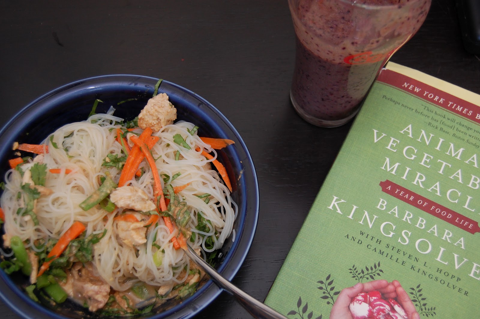 Cold asian noodles and a “green” smoothie (purple because of berries)